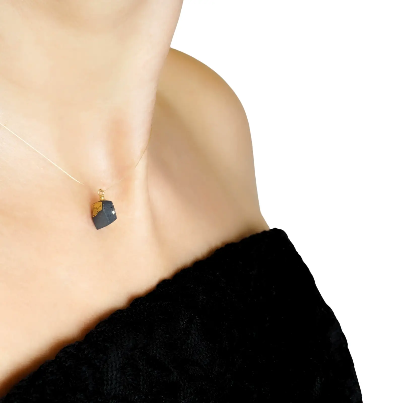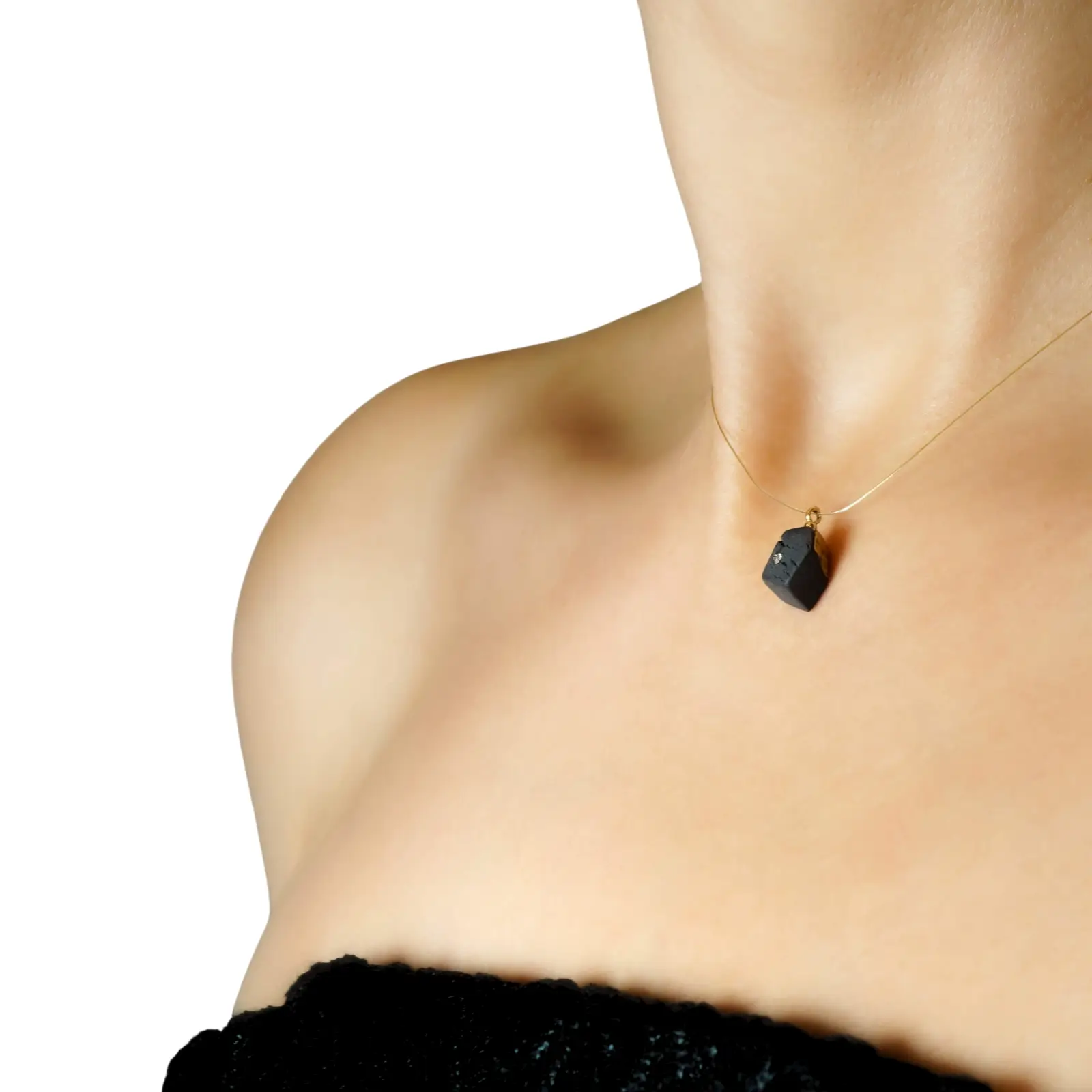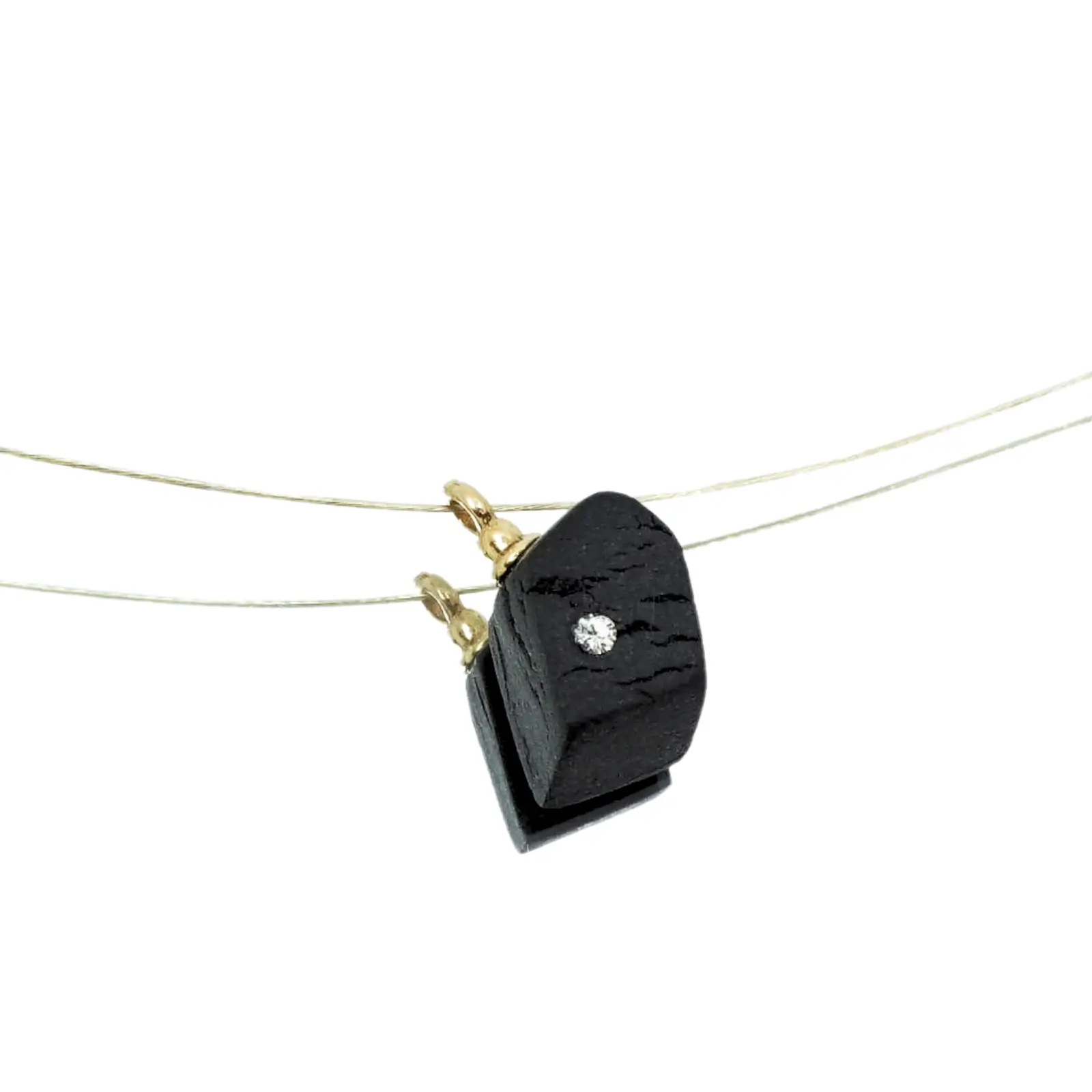 Kolje su porceliano pakabuku | Namelis – išskirtinis papuošalas, skirtas moteriai, kuri geba matyti grožį subtiliuose akcentuose. Miniatiūrinis juodo porceliano namelis, subtiliai besisupantis ant vos įžiūrimo auksu dengto troselio, tampa tylia, bet gilia žinute apie jaukumą, namus ir ryšį.